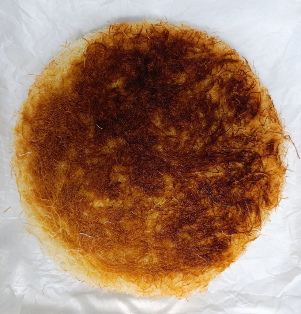 אטריות הקדאיף במחבת כך שמכסים את כל התחתית ועולים